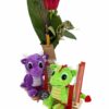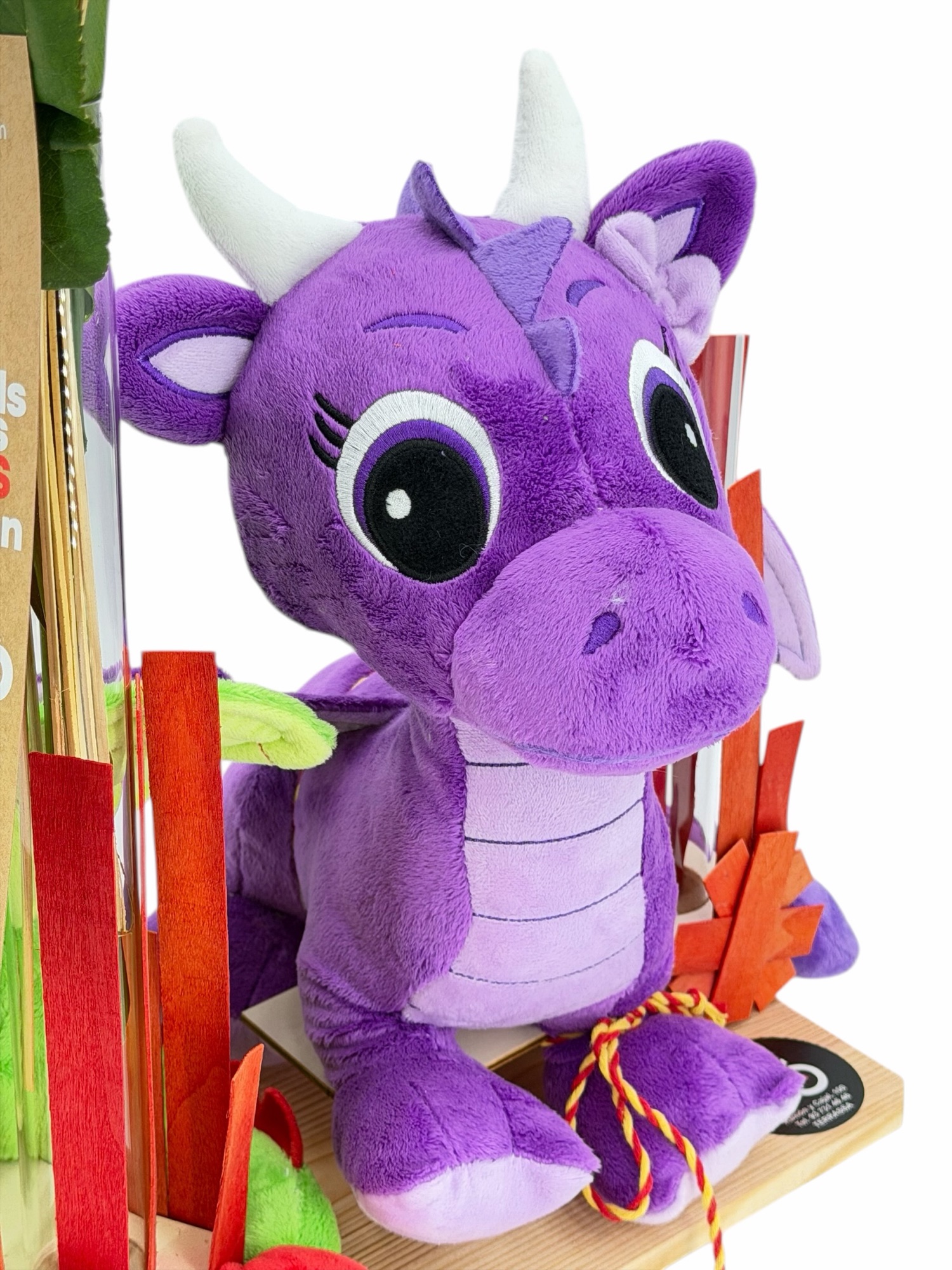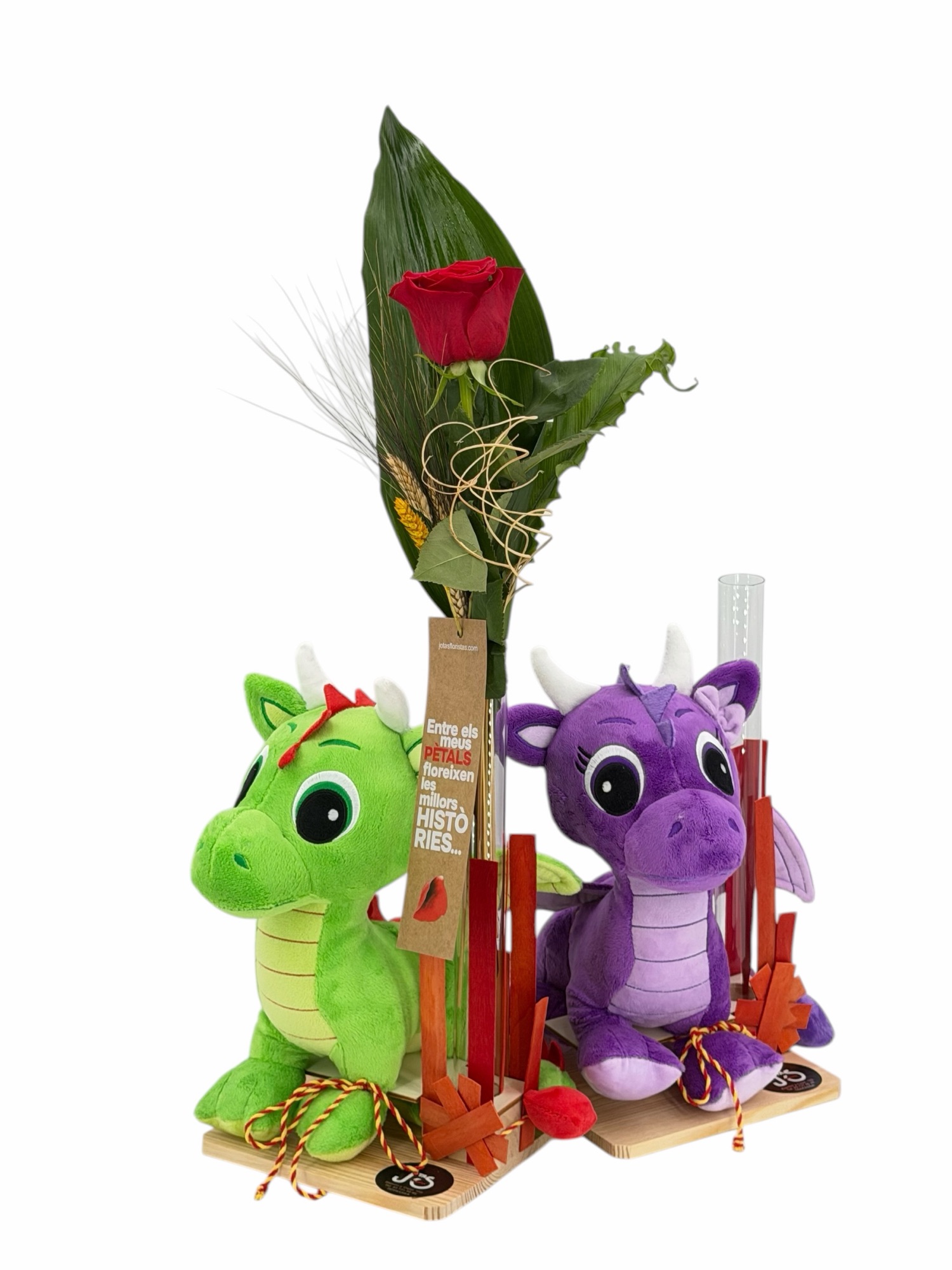 Drac Gran, Dragon de Sant Jordi en base de madera de pino natural, de peluche apto para niños, decorado con una rosa extra natural, señera, punto de libro, espigas y verdes variados.