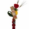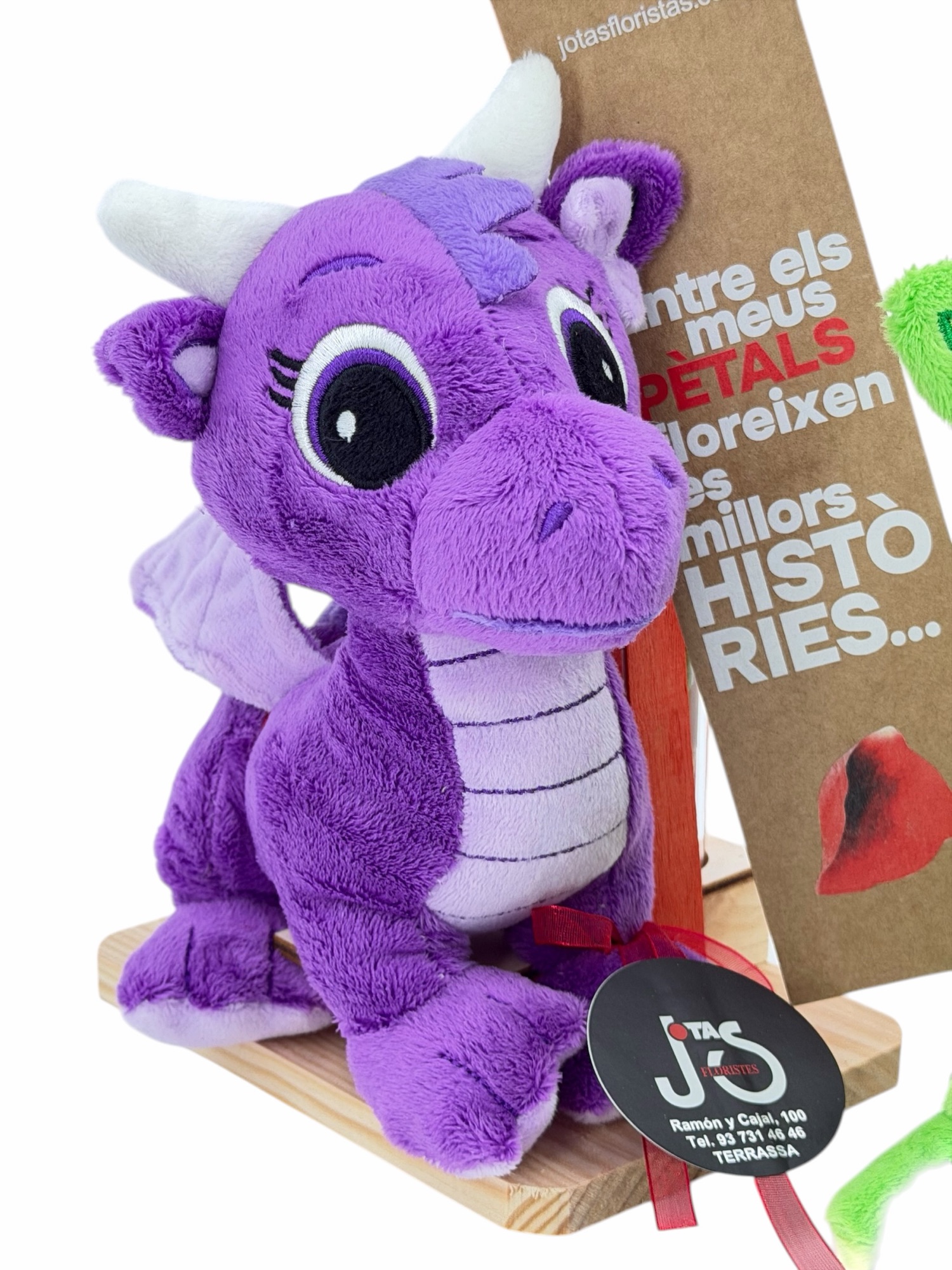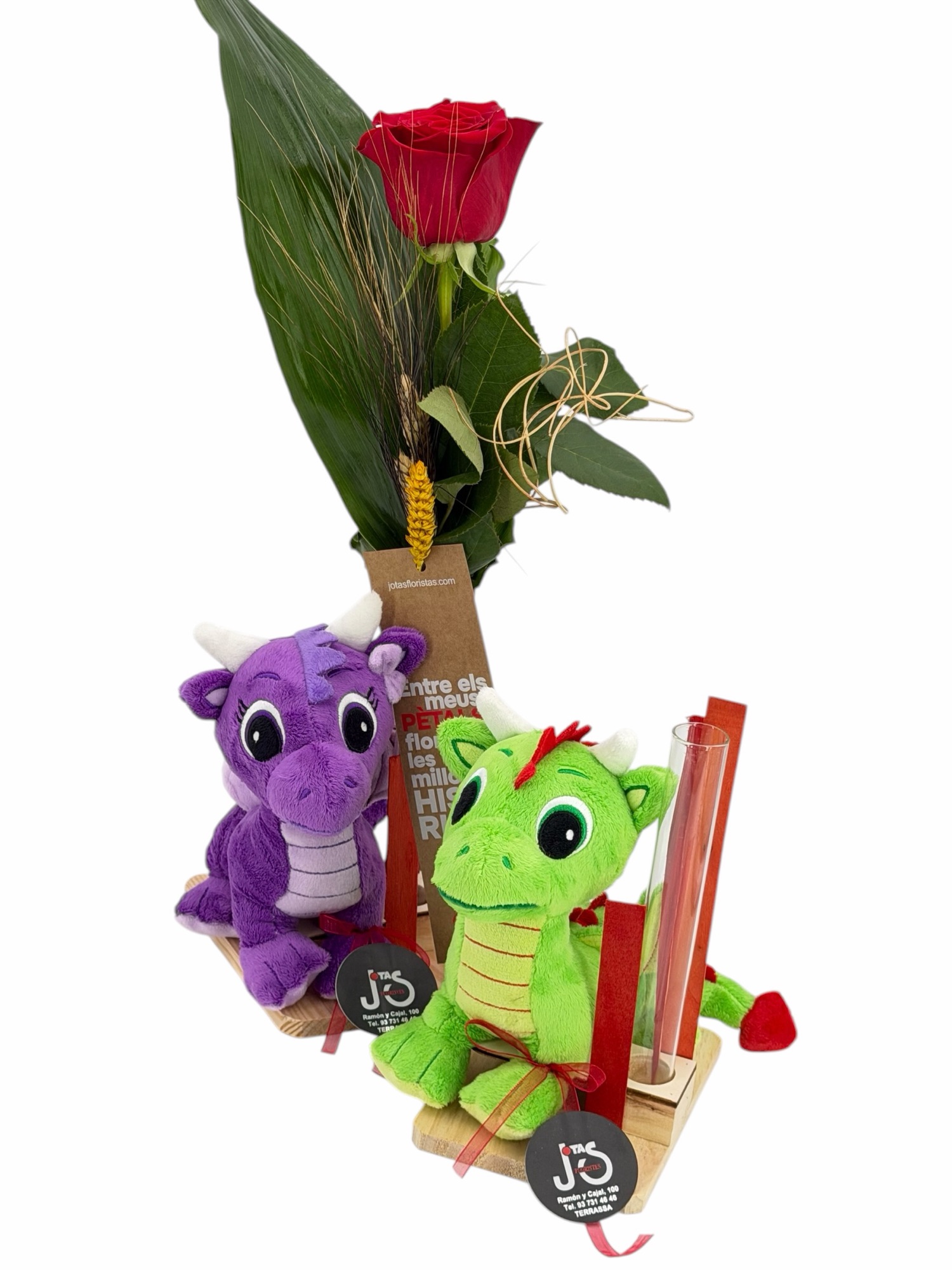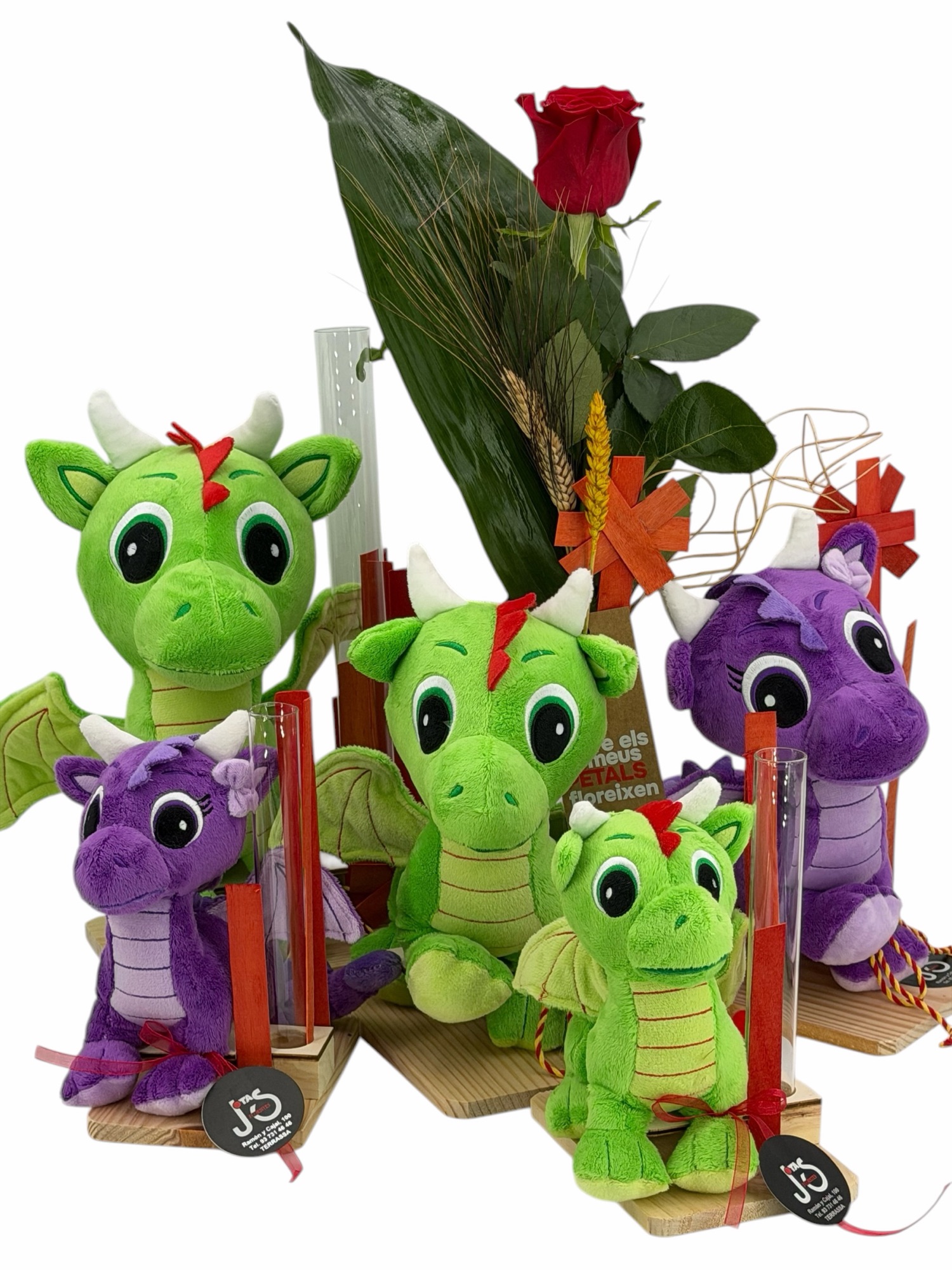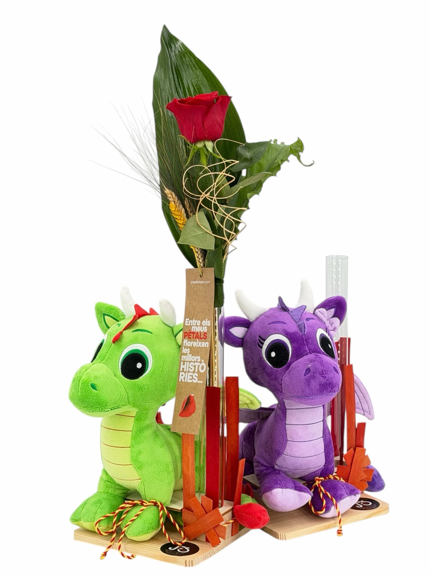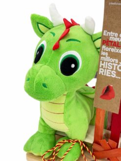 Drac Petit, Dragon de Sant Jordi en base de madera de pino natural, de peluche apto para niños, decorado con una rosa extra natural, punto de libro, señera, espigas y verdes variados.
