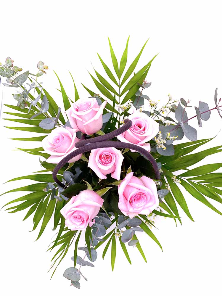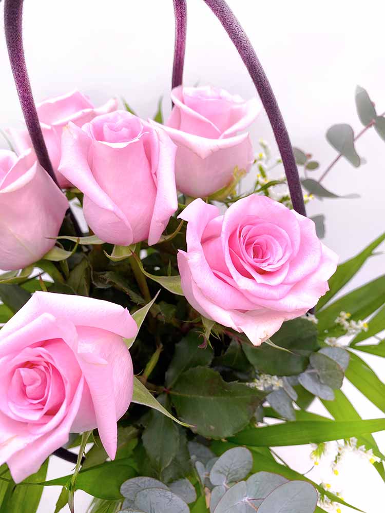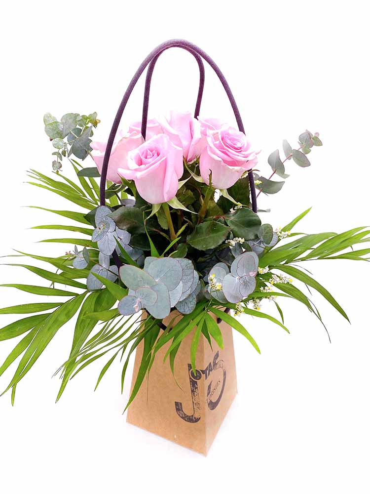 Bag 6 Rosas Rosadas, 6 bonitas rosas de colores rosa, fuxia o lilosos según disponibilidad, en un práctico jarrón de cartón 100% reciclado con unas prácticas asas en forma de bolso para poder facilitar su transporte, la mejor selección de rosas importadas directamente desde Ecuador, cultivadas en la prestigiosa finca ROSAPRIMA donde se realiza su recolección minuciosamente con corte Americano para asegurar una maduración lenta y total de sus cabezas.