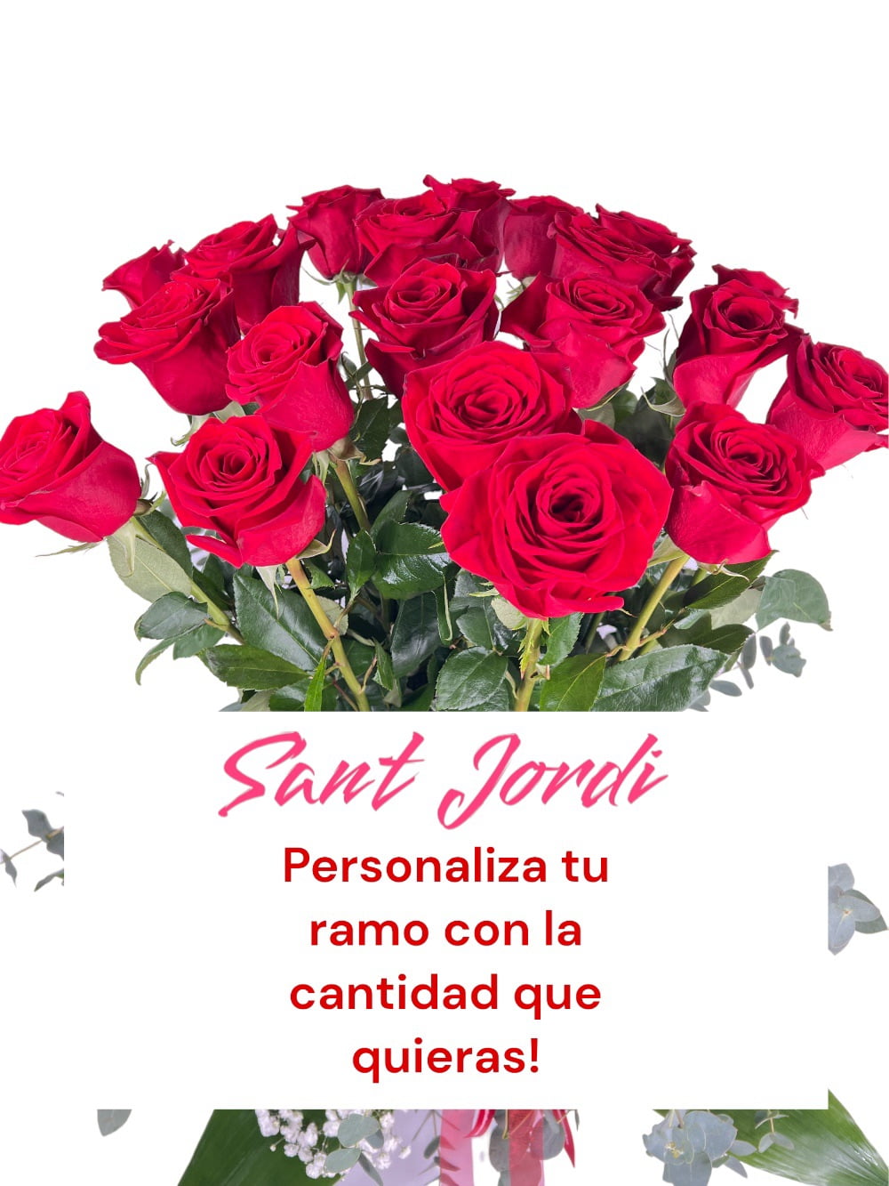 Personaliza tu ramo de Rosas de Sant Jordi. Aquí puedes personalizar y decidir la cantidad de rosas que quieres que tenga tu ramo en el día mas especial del año, solo tienes que escoger el número de rosas en el desplegable y listo!!