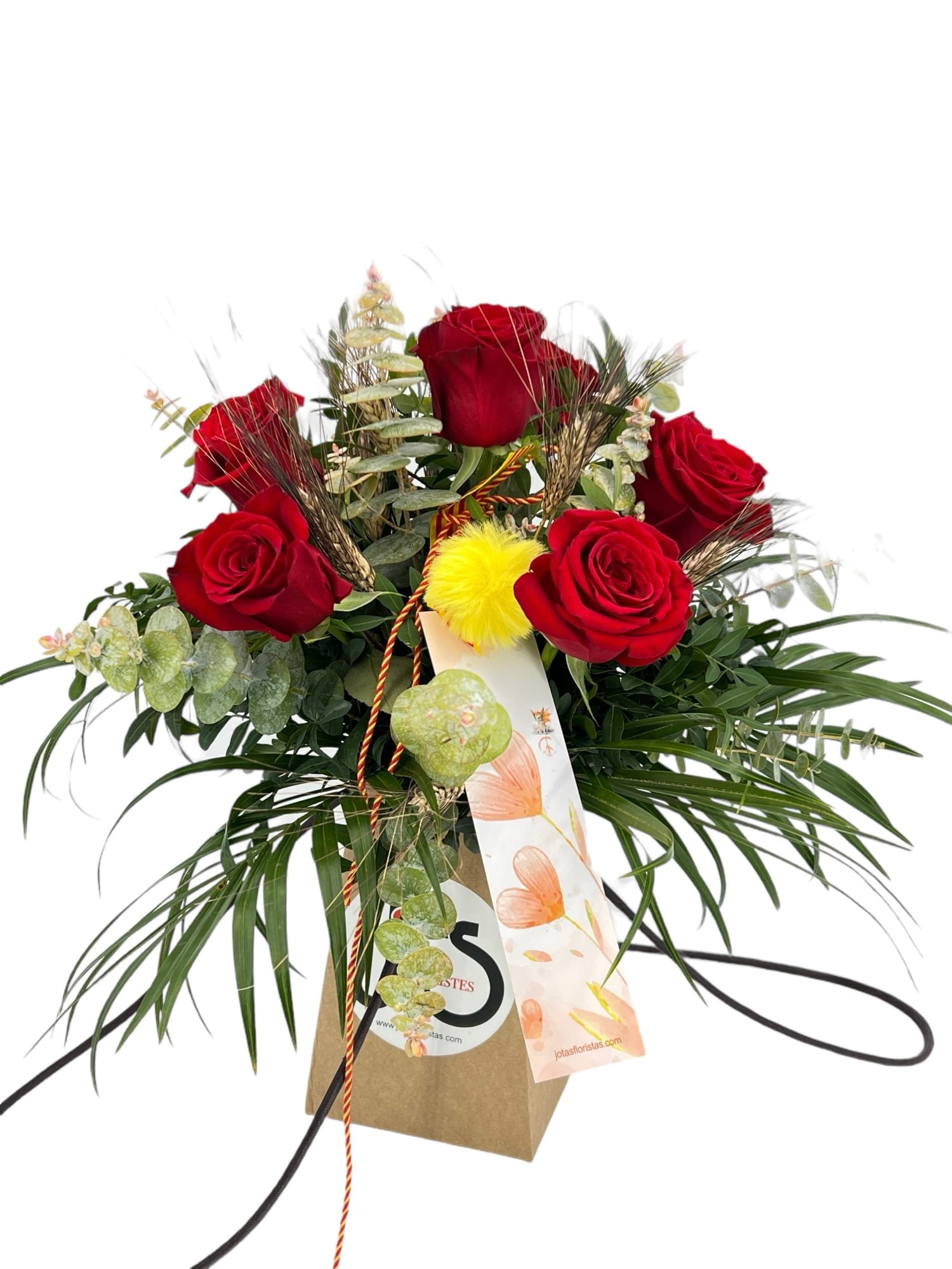Bag Sant Jordi, 6 bonitas rosas de color rojo en un práctico jarrón de cartón 100% reciclado con unas prácticas asas en forma de bolso para poder facilitar su transporte, la mejor selección de rosas importadas directamente desde Ecuador, cultivadas en la prestigiosa finca ROSAPRIMA donde se realiza su recolección minuciosamente con corte Americano para asegurar una maduración lenta y total de sus cabezas.
