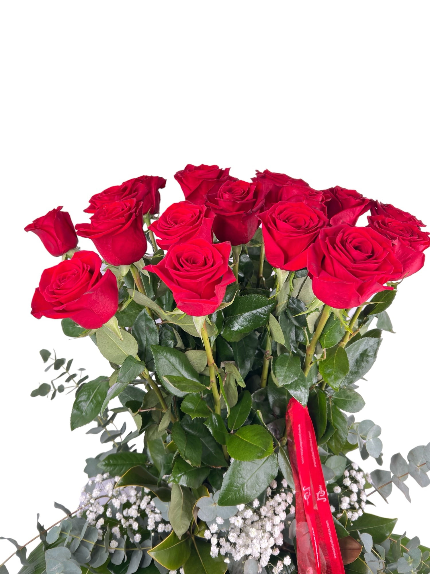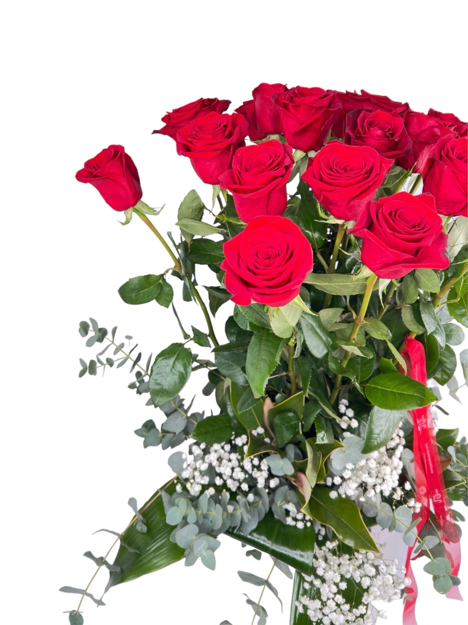 Todos nuestros Ramo de Rosas Terrassa van acompañados de la mejor selección de verdes de la temporada y espuma Oasis con agua tratada con floralife.