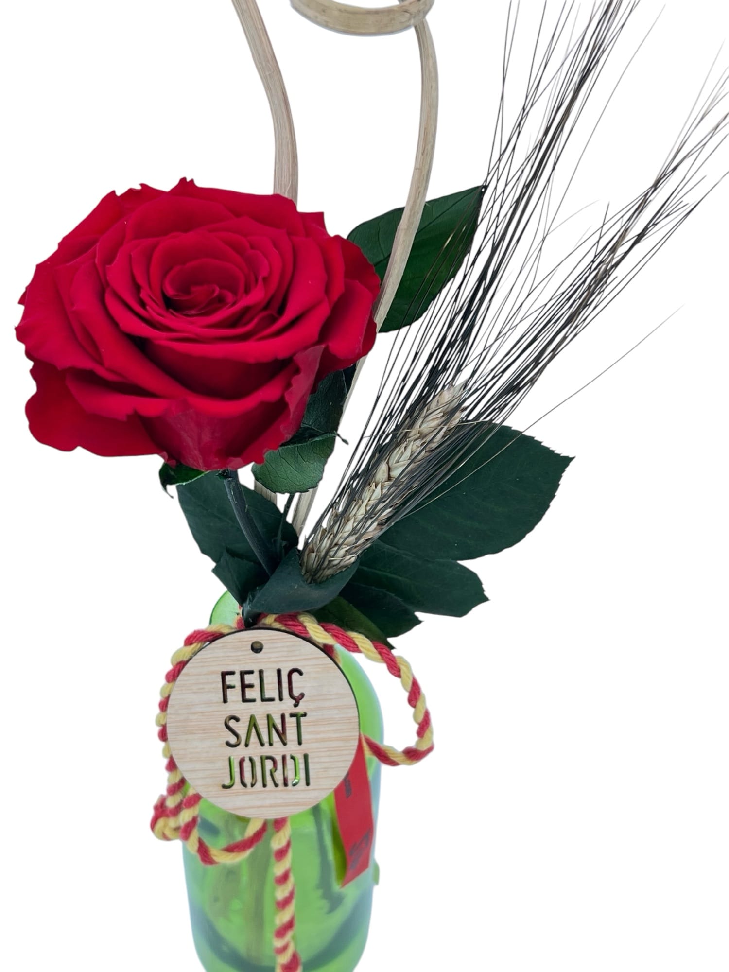 Rosa Preservada Bottle, Rosa Eterna de color rojo manipulada por nosotros de forma única y artesanal en un jarrón de cristal de color, un detallazo romántico la mejor manera de demostrar el amor que perdura por siempre eternamente.