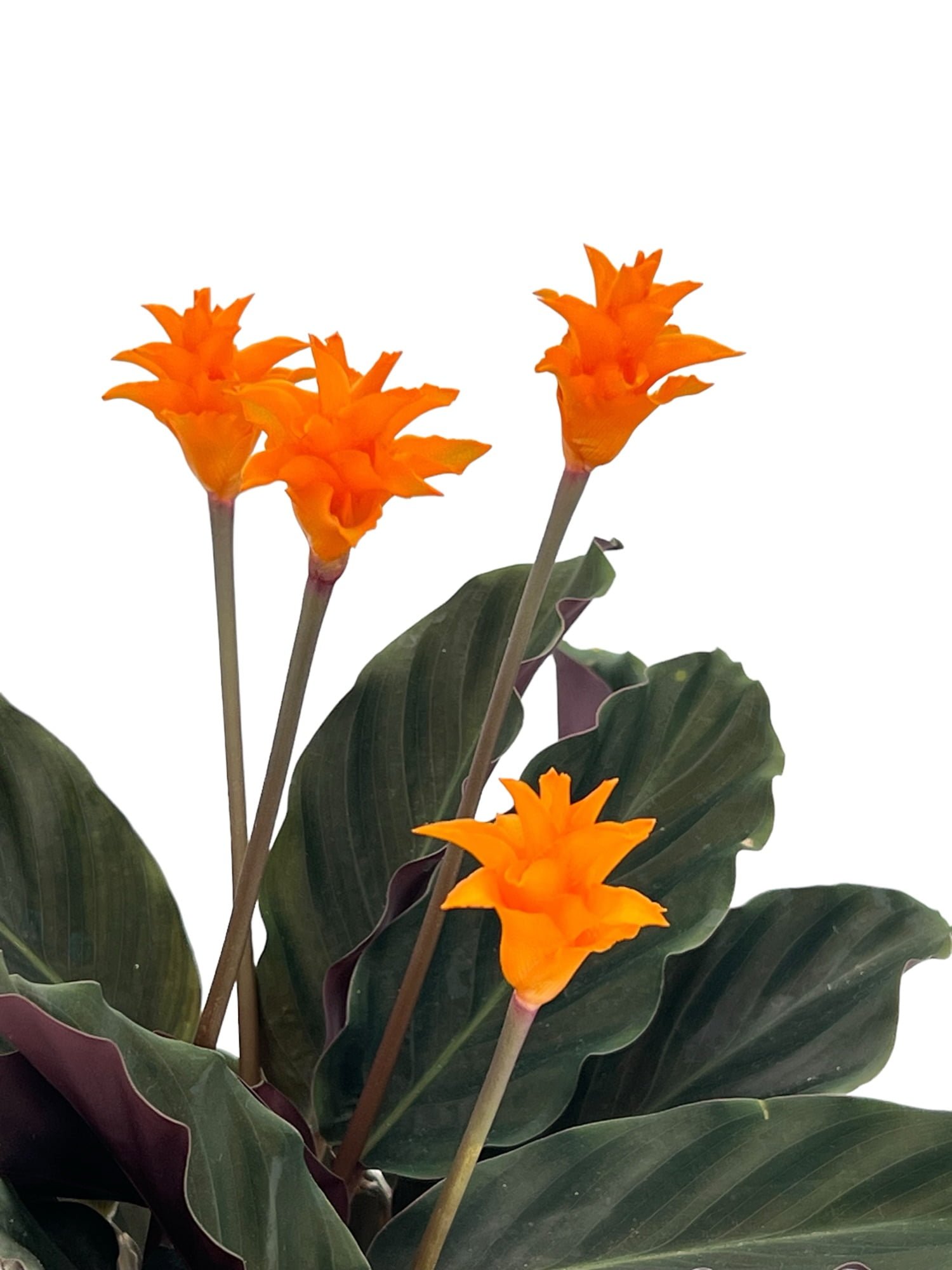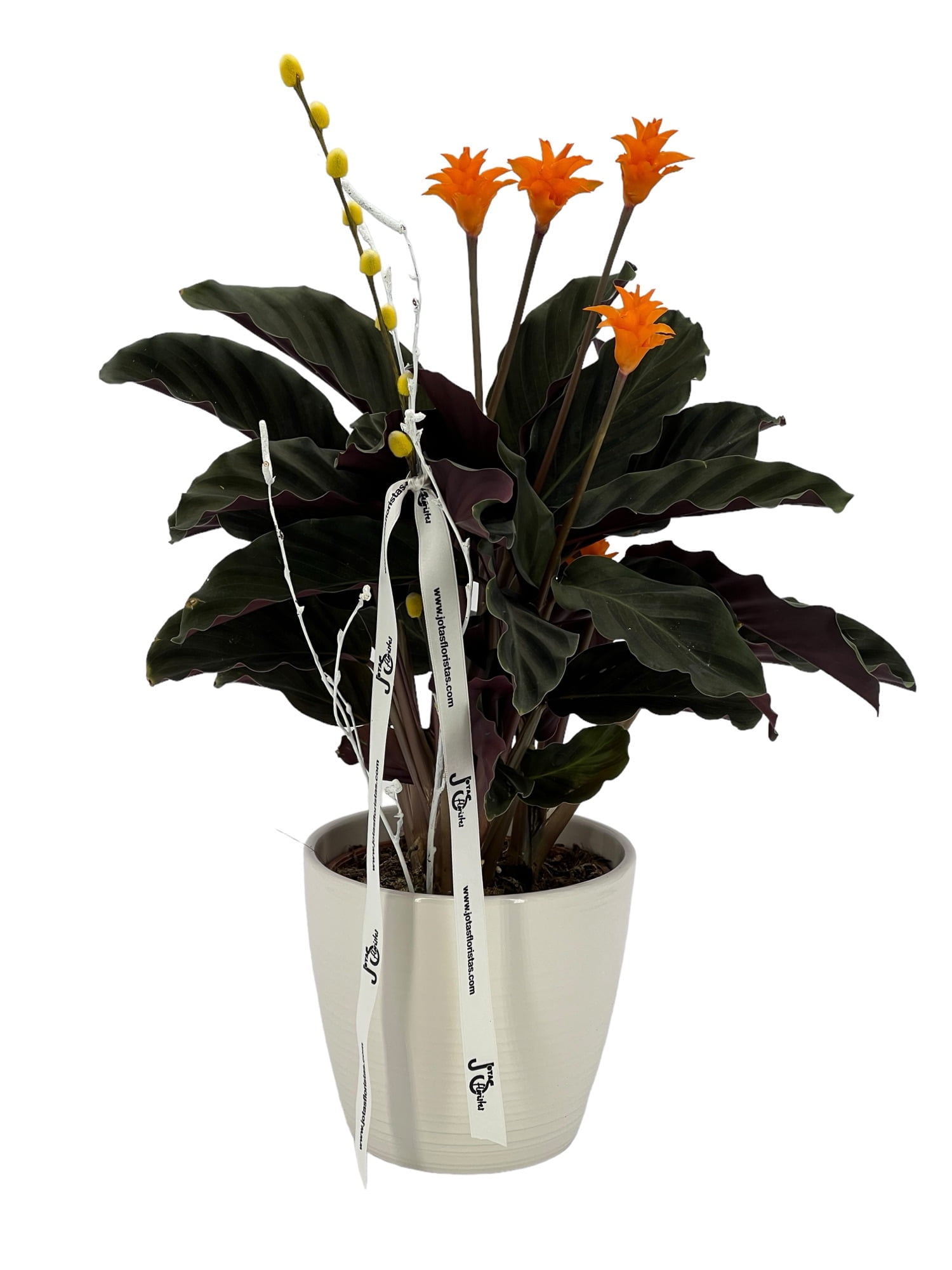 - Agua: éste es el punto más delicado de la Clathea Crocata. Debe disfrutar siempre de un elevado grado de humedad ambiental. Es recomendable rociarla a diario, especialmente en los meses calurosos (y en invierno si usas calefacción). Si no tienes tiempo puedes colocar bajo la maceta un plato con piedras o guijarros húmedos. Evitarás encharcar las raíces y conseguirás humedad constante durante varios días. Por último, el riego debe ser frecuente y controlado. Aproximadamente dos veces por semana en las épocas cálidas y una vez en las más frías.