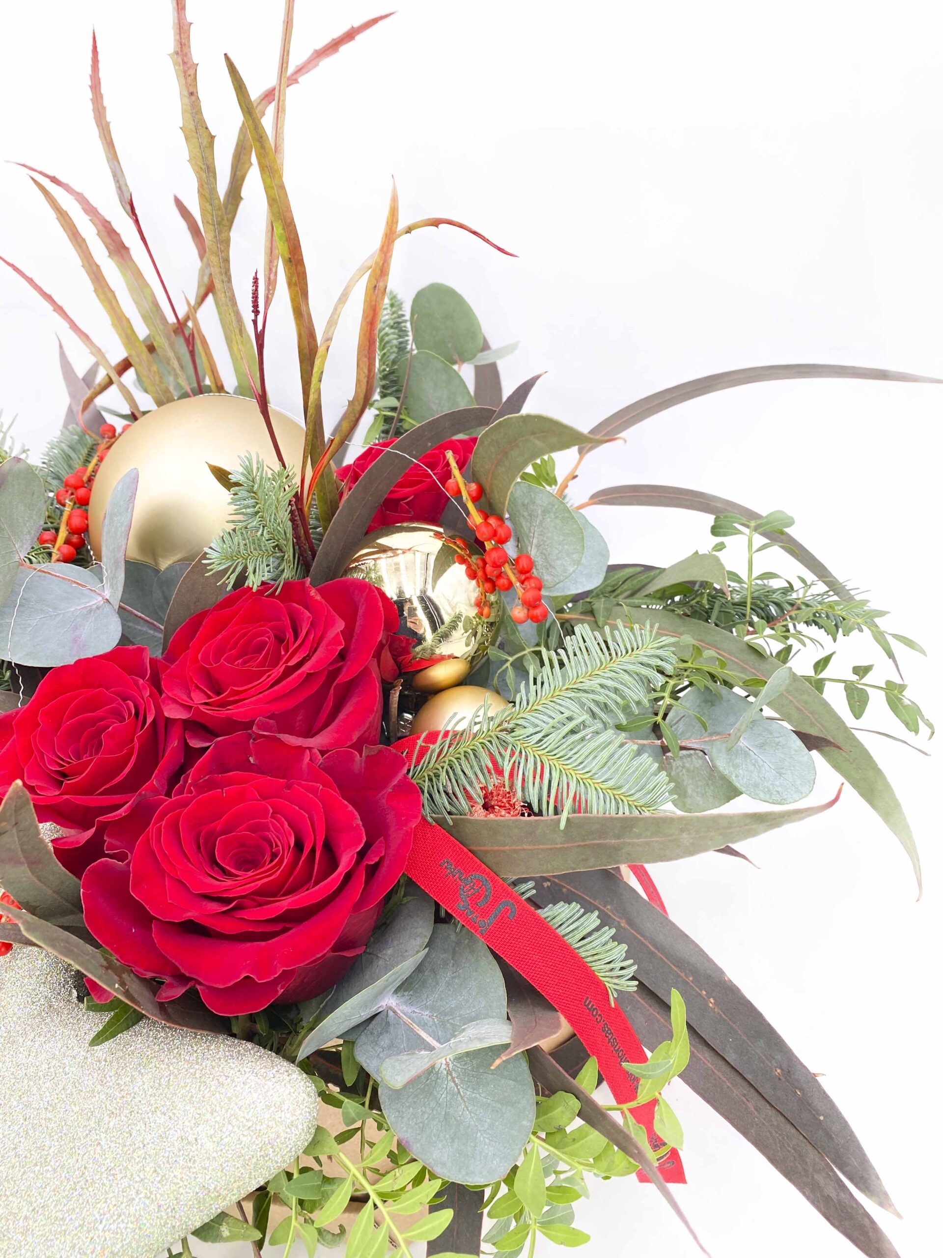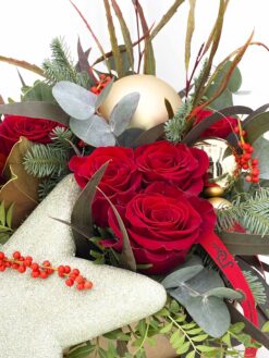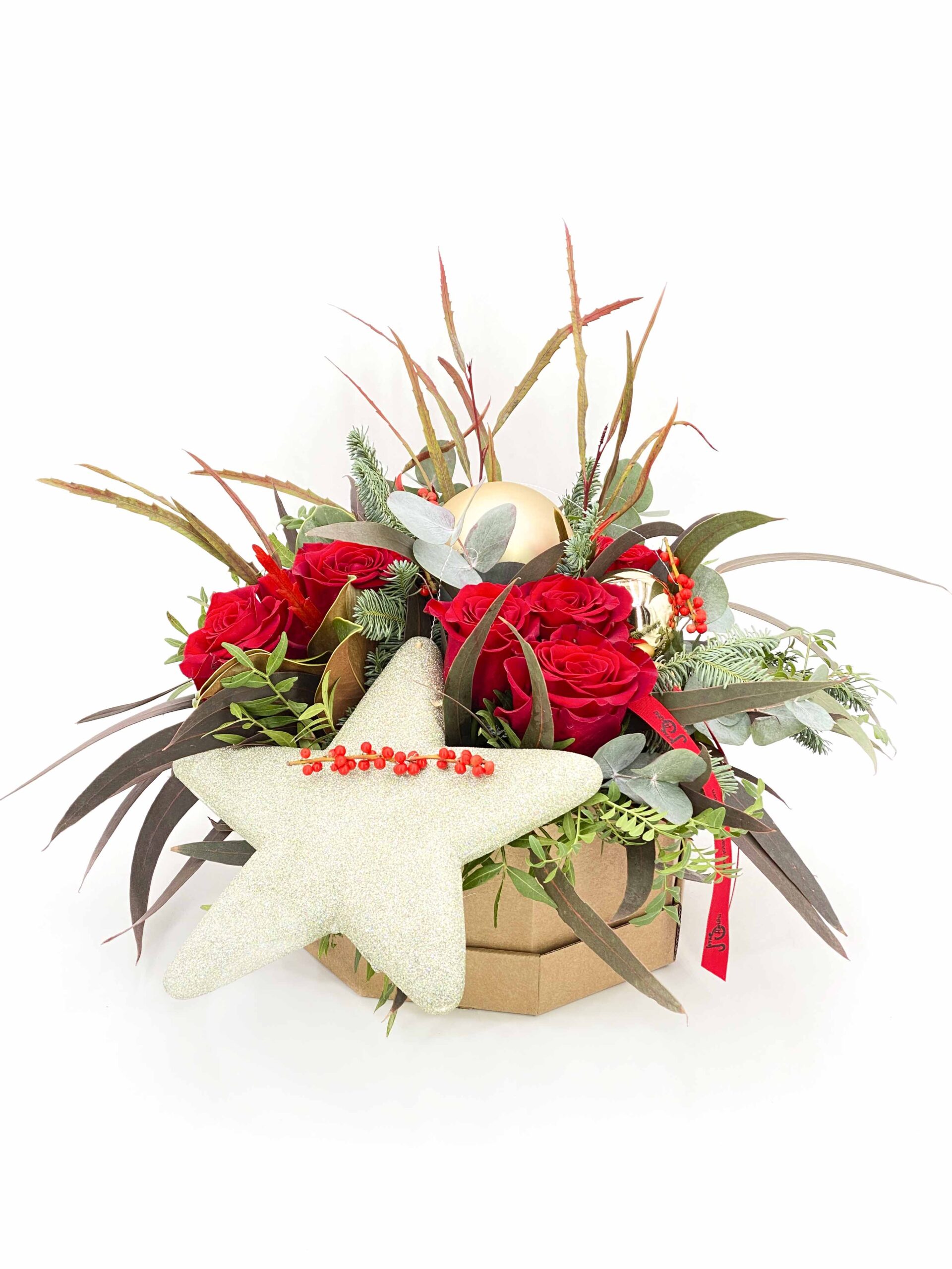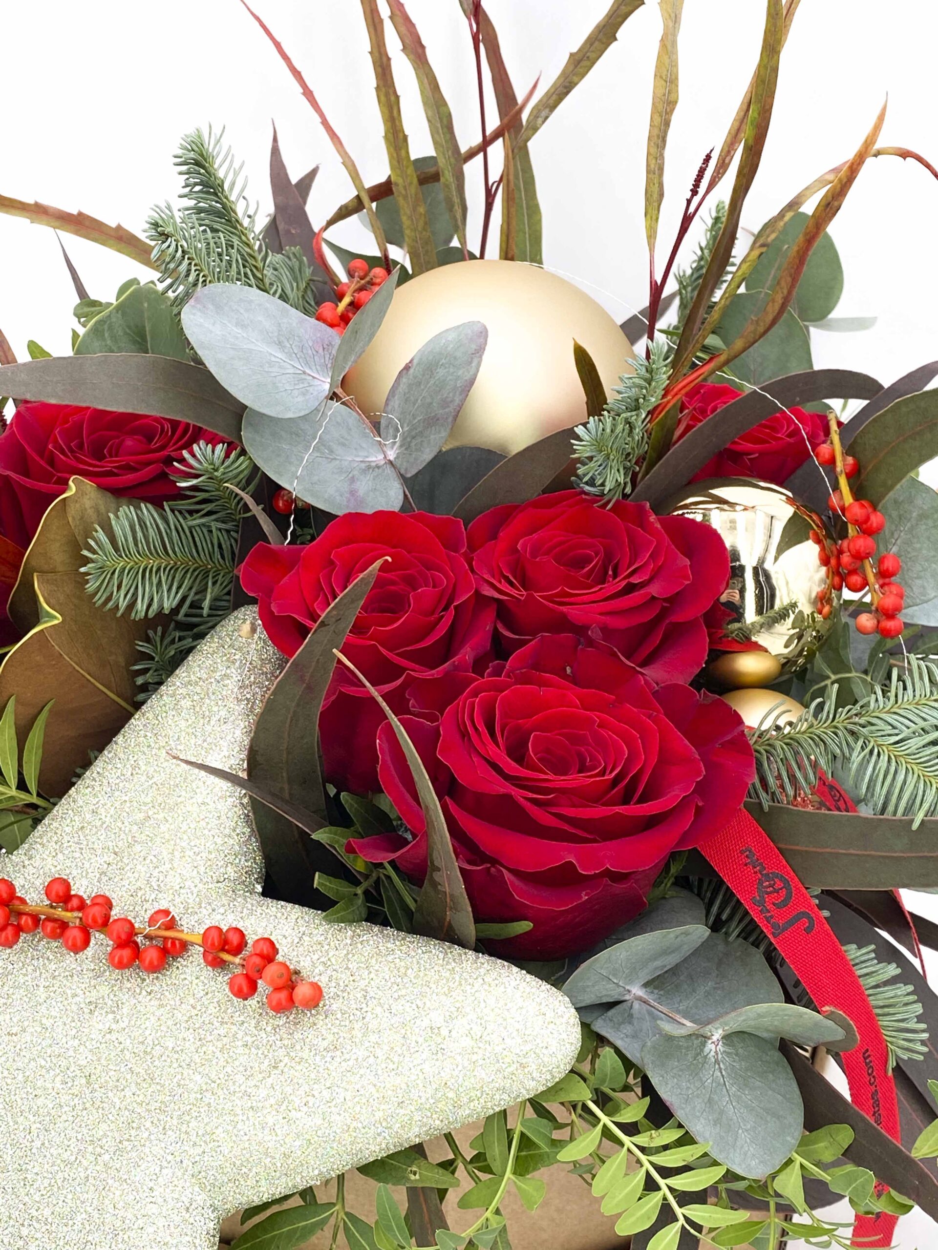 HatBox XMAS, bonito ramo de rosas rojas y verdes de navidad en tonalidades rojizas y hojas verdes, montado sobre nuestras HatBox XMAS, un práctico soporte de cartón 100% reciclable