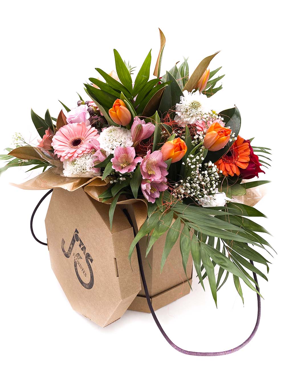 HatBox Variado, bonito ramo de flores variadas según la temporada en tonalidades variadas y hojas verdes, montado sobre nuestras HatBox , un práctico soporte de cartón 100% reciclable que contiene su esponja empapada en agua para una correcta hidratación y asas para su transporte.