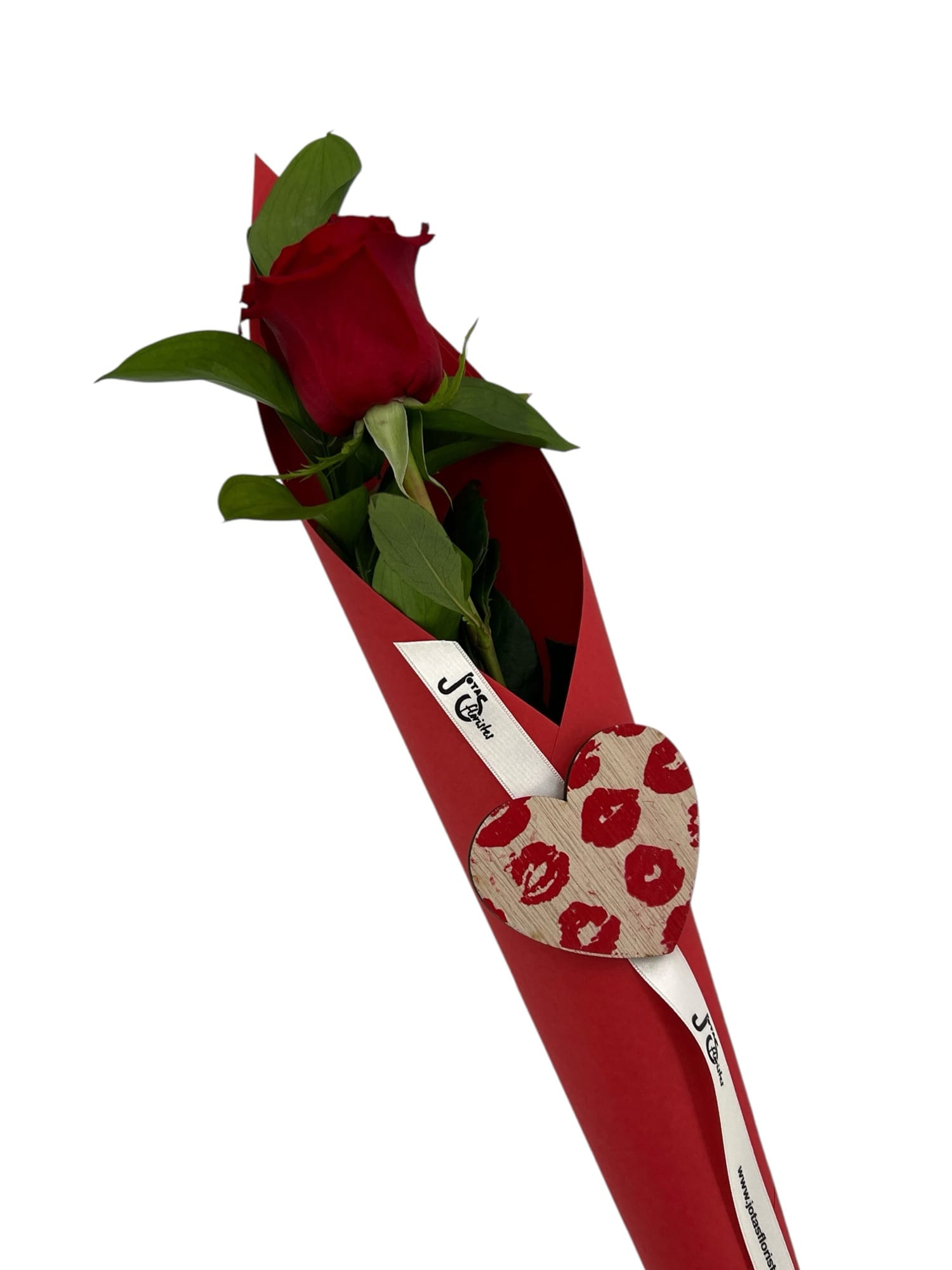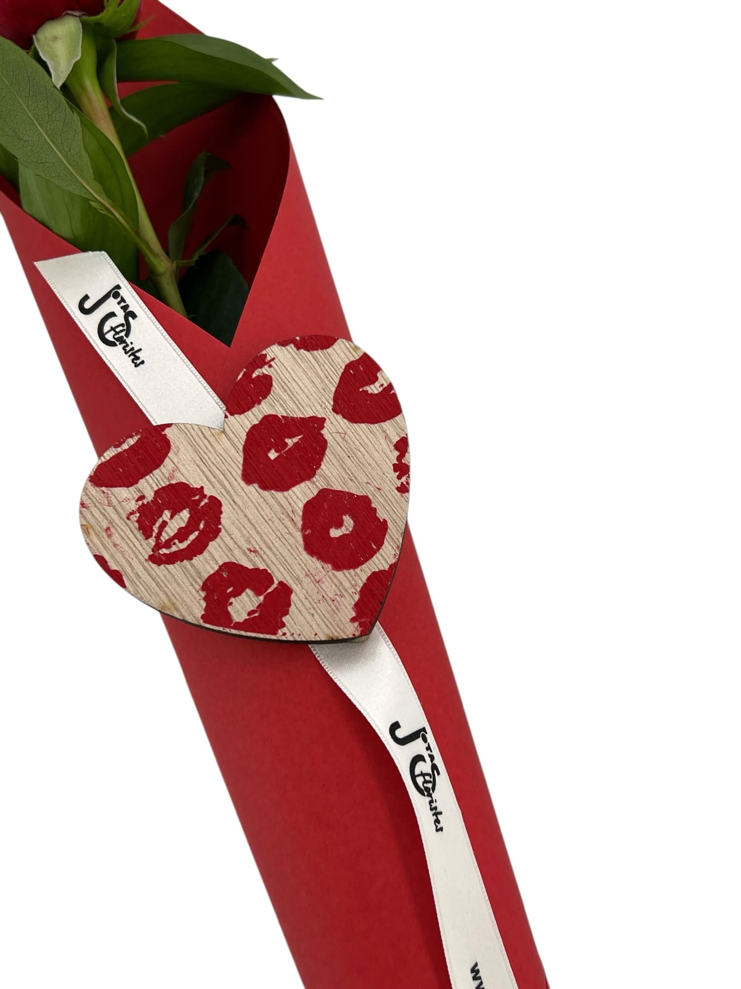 Rosa Love, 1 rosa natural con verdes y envoltorio especial De San Valentín acompañada de un corazón lleno de besos